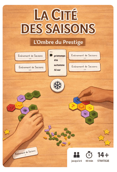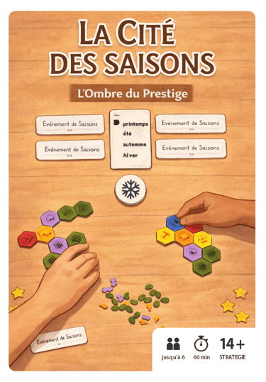 La Cité des Saisons est un jeu de développement stratégique où chaque joueur façonne sa propre évolution à travers le temps. Construire, produire, échanger, convertir… chaque décision compte et ouvre différentes voies vers le Prestige. Ici, il n’y a pas une seule manière de gagner, mais plusieurs stratégies viables à explorer.